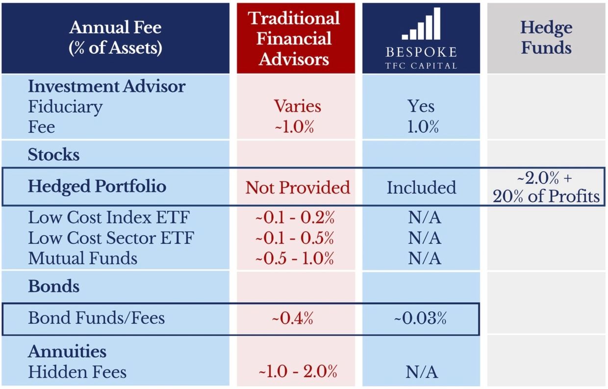 Bespoke TFC Capital provides the rare investment advisor service of customized hedged portfolios with downside protection and hedged (extra) income for client accounts of $300,000 - $10,000,000 across Orlando, Florida, The Villages, and the entire United States.