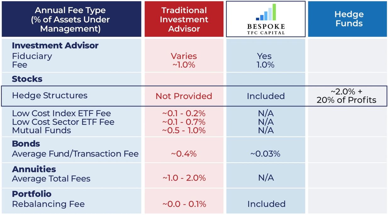 The motivation for Bespoke TFC Capital is to provide more individuals with customized hedged portfolios, beyond the historic base of ultra high-net-worth (UHNW) investors. These enhanced portfolios have the potential to generate superior risk-adjusted returns, via additional hedged income generation and stock market protection.